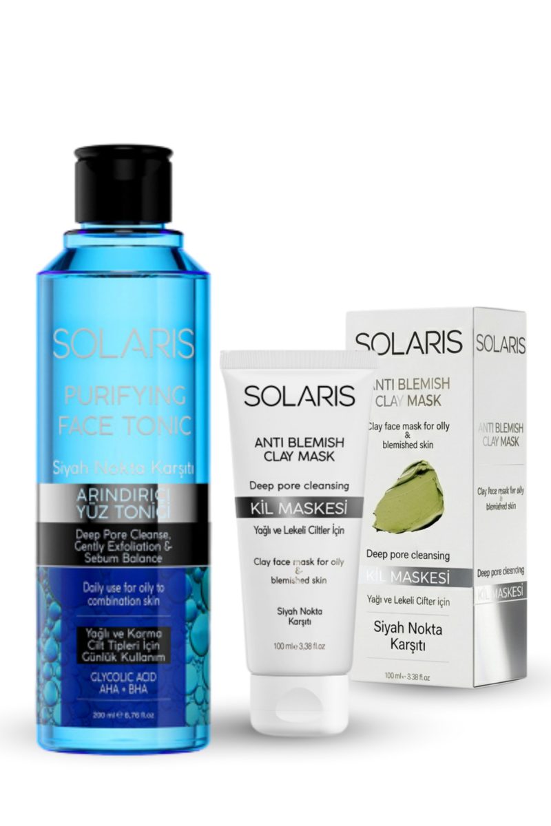 Solaris Kil Maskesi Yağlı ve Lekeli Ciltler İçin 100 ml ve Yağlı Ve Karma Ciltler Için Siyah Nokta Karşıtı Arındırıcı Yüz Temizleme Toniği 200 ml
