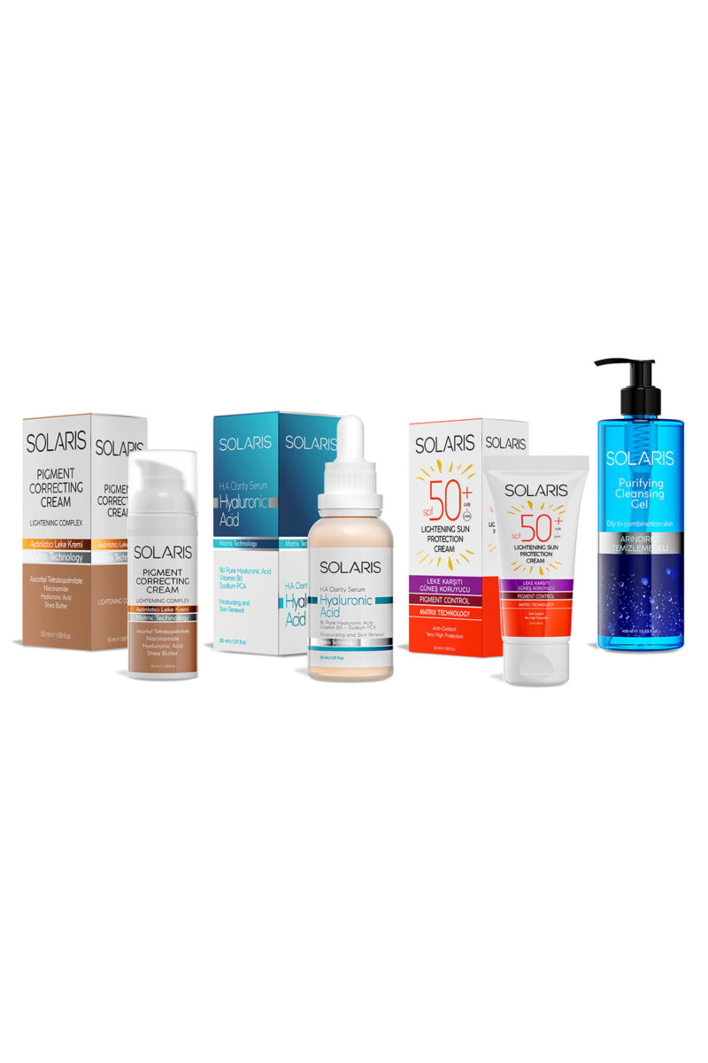 Solaris Aydınlatıcı Leke Krem Ve Hyaluronic Acid Serum Ve Leke Karşıtı Güneş Krem Ve Temizleme Jeli